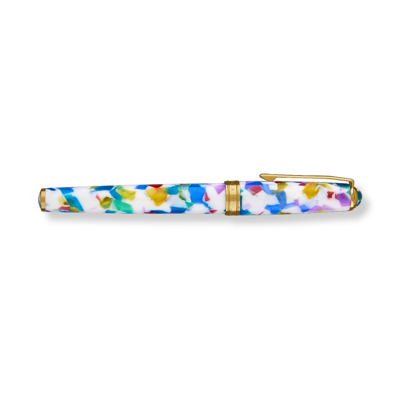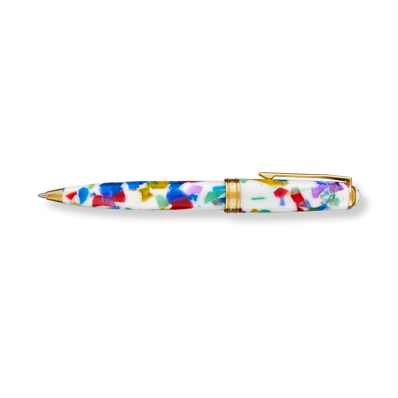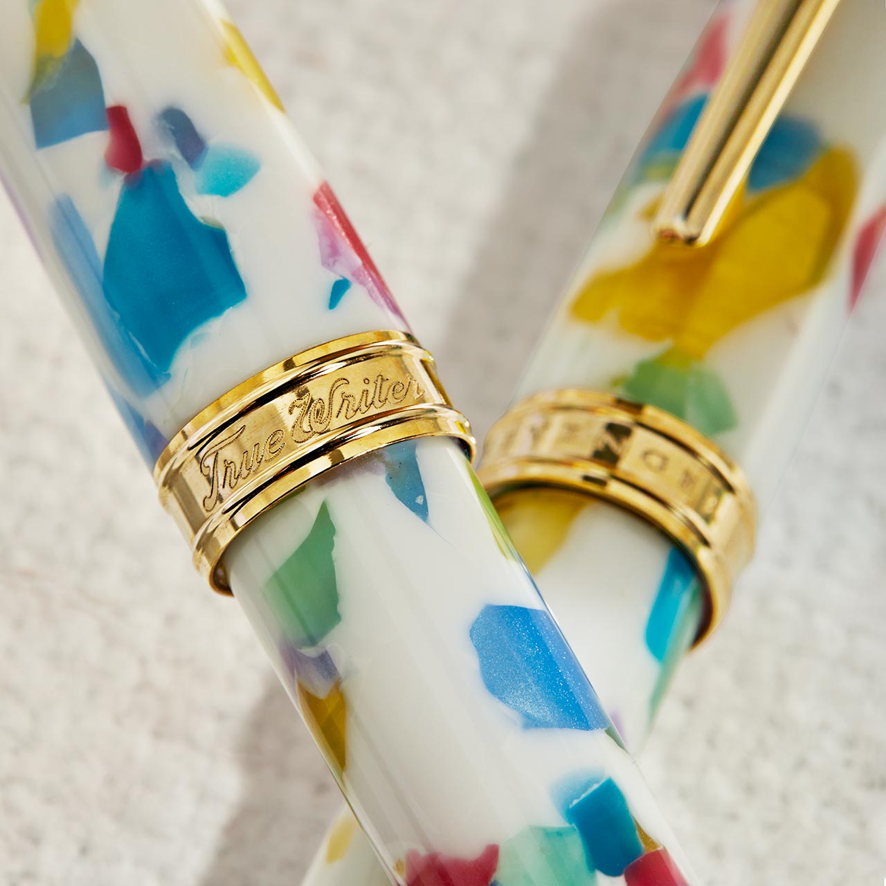 With its dreamy mélange of speckled colors resembling the traditional Italian fruitcake, the eye-catching True Writer Classic Panettone Pen makes writing by hand a festive experience. The white resin barrel, dotted with candied flecks of blue, yellow, red, green and purple, is set off by gleaming 24k gold-plated trim and appointments. As always, this True Writer pen is perfectly weighted and balanced for consistent writing comfort. Personalize it with a 3-initial monogram or full name of up to 16 characters. Rollerball or Ballpoint.
