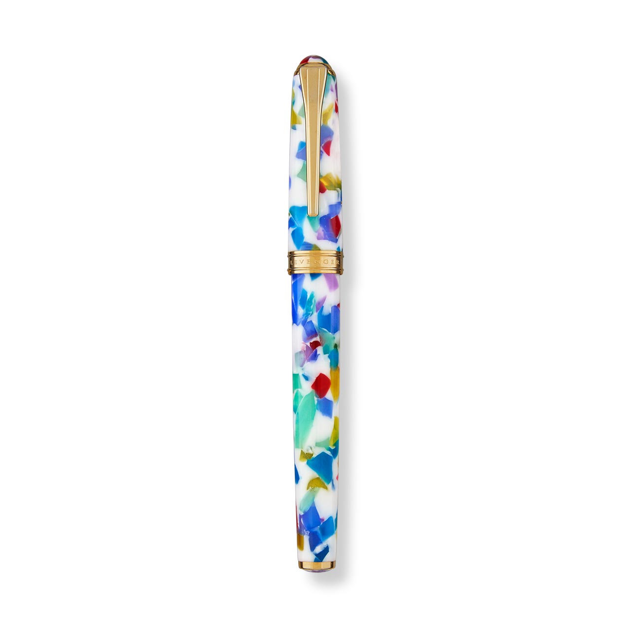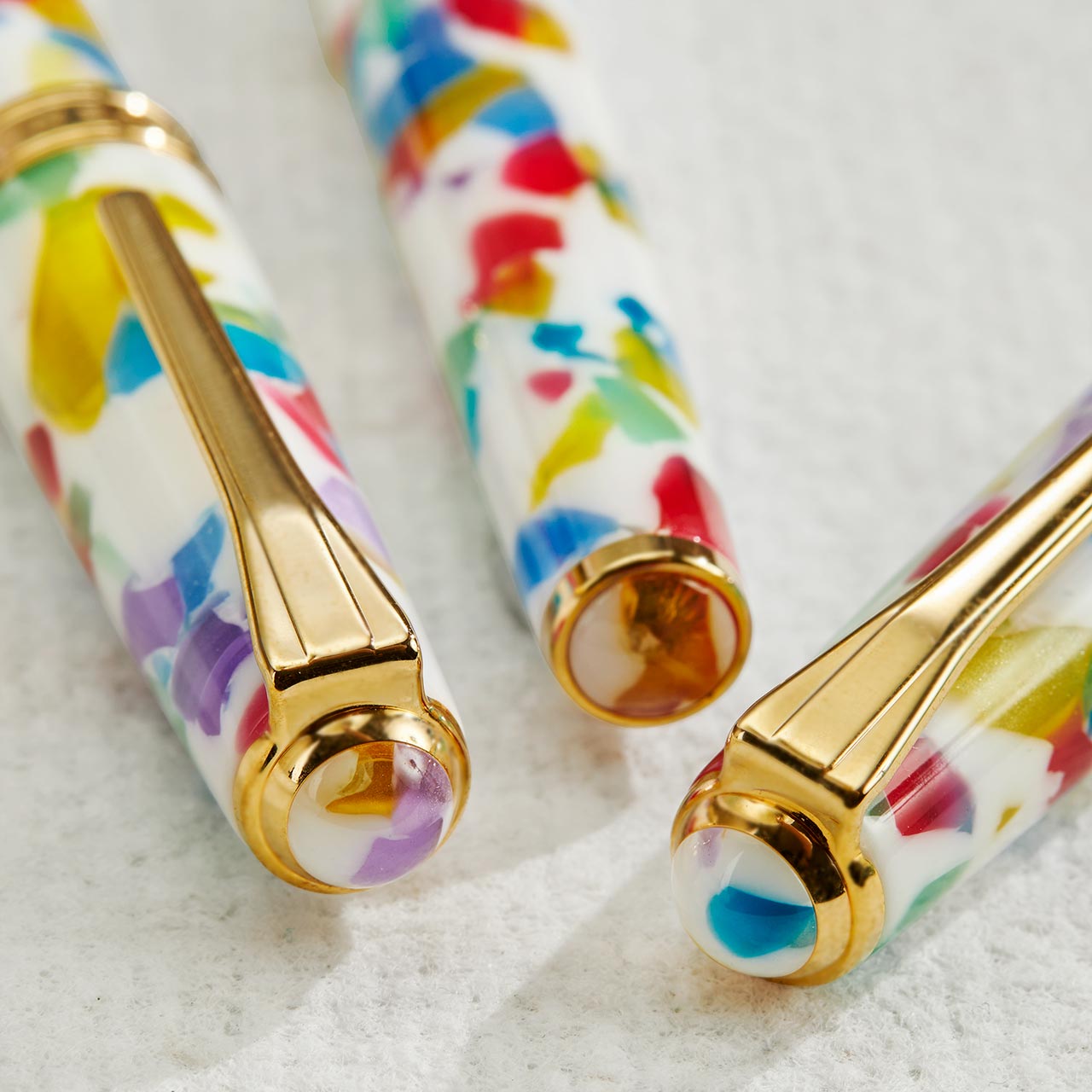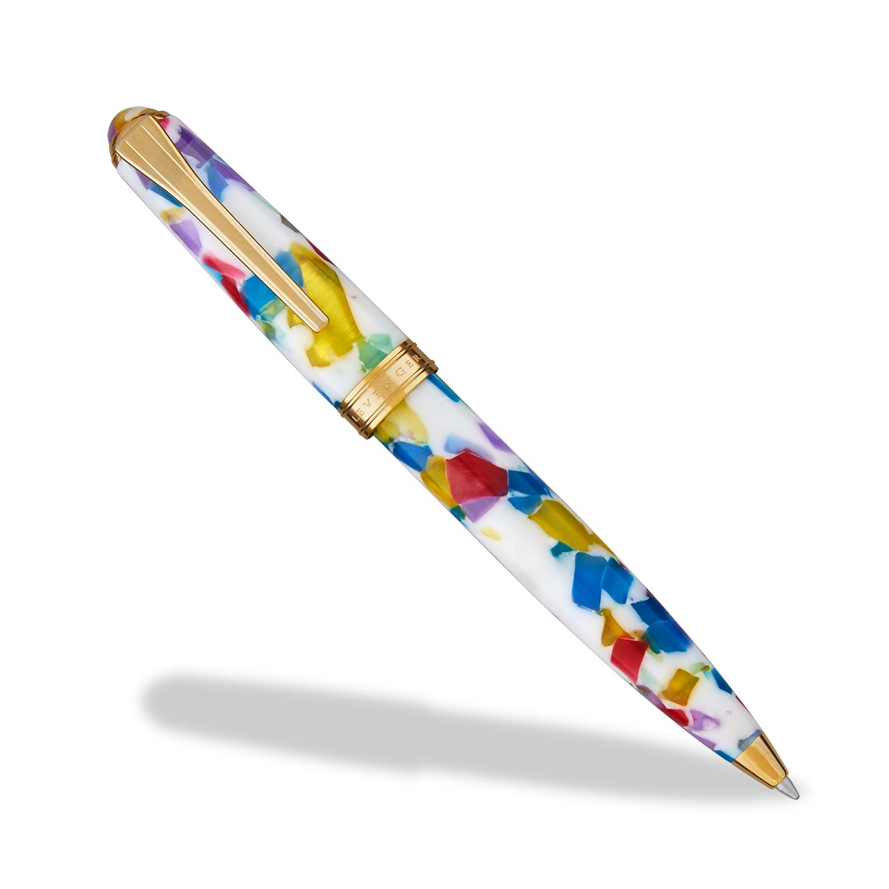 With its dreamy mélange of speckled colors resembling the traditional Italian fruitcake, the eye-catching True Writer Classic Panettone Pen makes writing by hand a festive experience. The white resin barrel, dotted with candied flecks of blue, yellow, red, green and purple, is set off by gleaming 24k gold-plated trim and appointments. As always, this True Writer pen is perfectly weighted and balanced for consistent writing comfort. Personalize it with a 3-initial monogram or full name of up to 16 characters. Rollerball or Ballpoint.