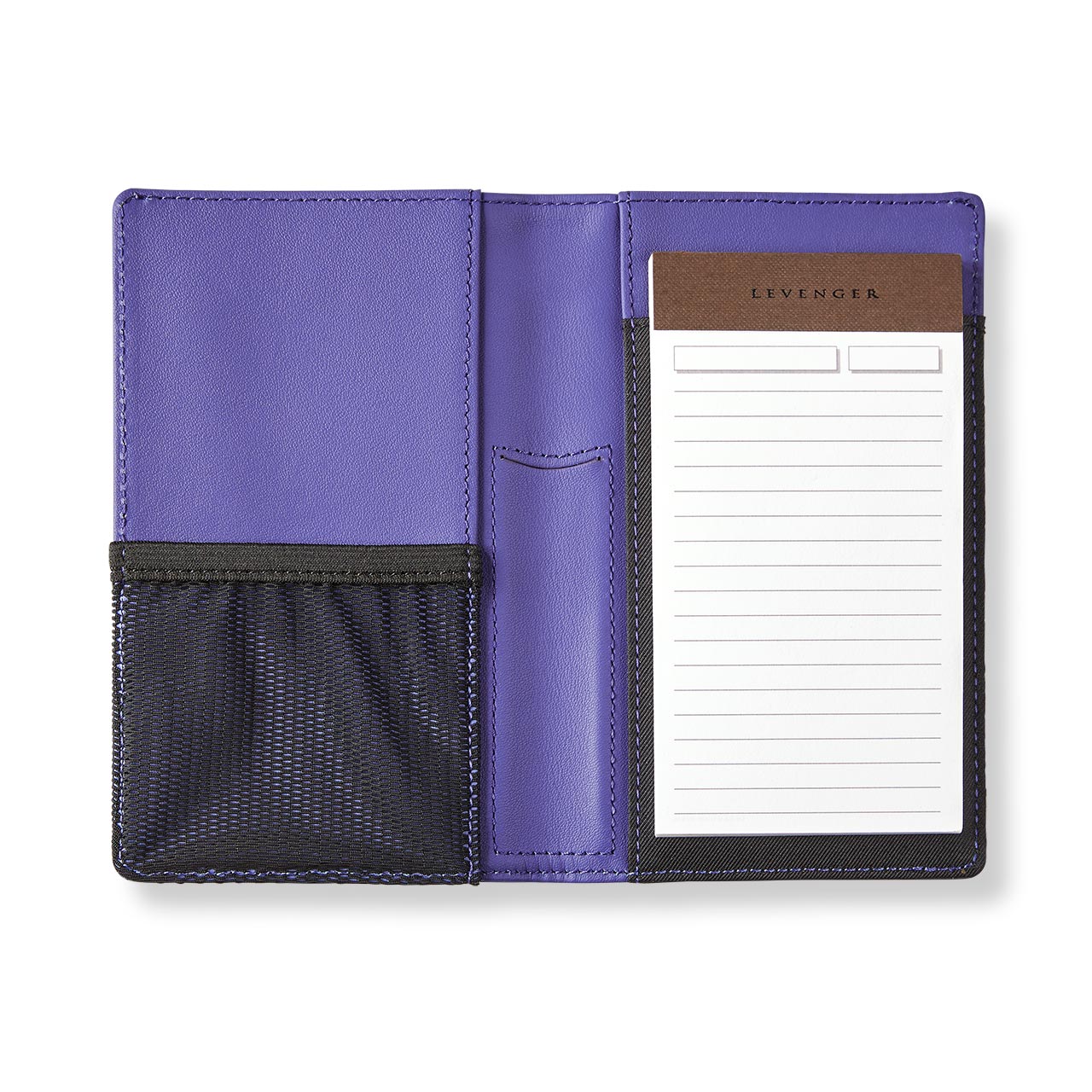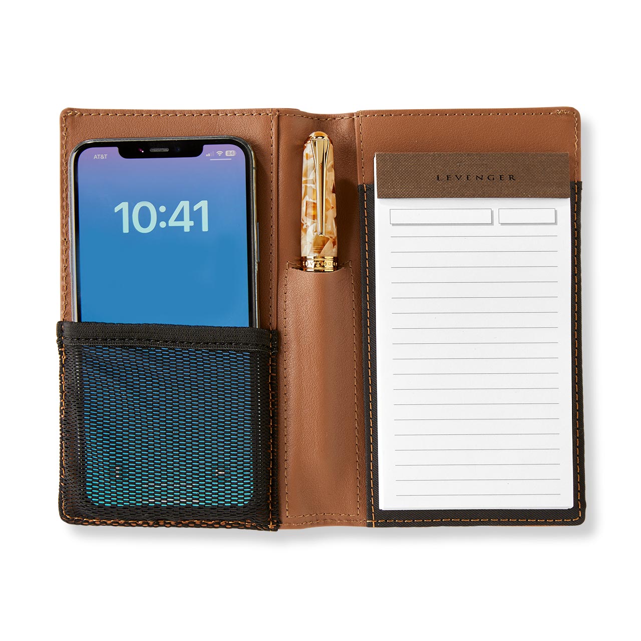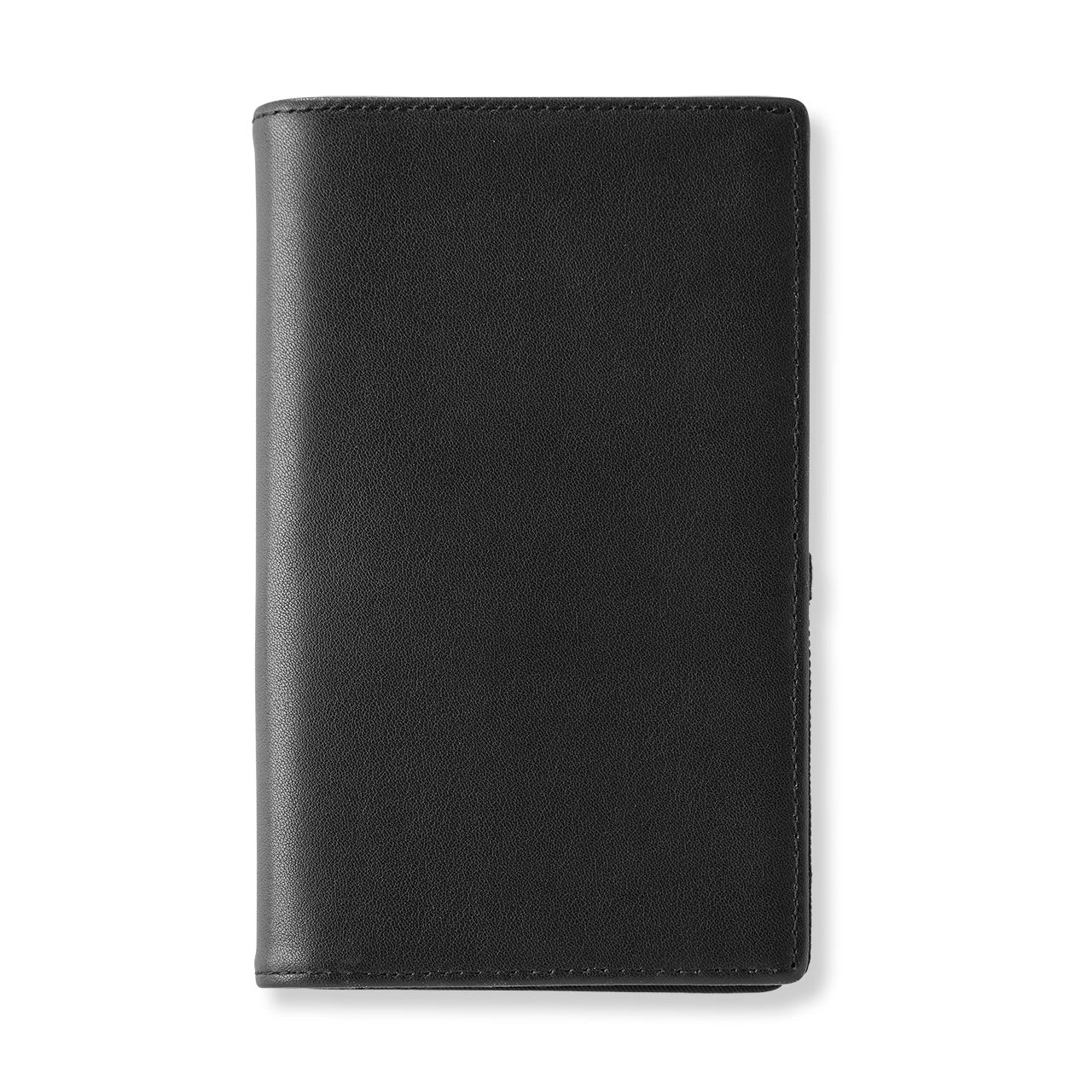 Want to see your logo on this product? Call 800.357.9991 or email corpsales@levenger.com. This combination smartphone case and notepad is the perfect marriage of digital and heritage technologies. (We use both, so why not keep them in one place?) The Best of Both Worlds Palm Folio can accommodate an iPhone 14 Pro Max in the elastic mesh pocket on the left, while the 3 x 5 pad on the right makes it easy to capture those on-the-go notes. The pen sleeve is ideal for a (available separately). The deep top pocket and interior slip pocket can hold bills, cards or receipts. Make it your own with a 3-initial monogram.