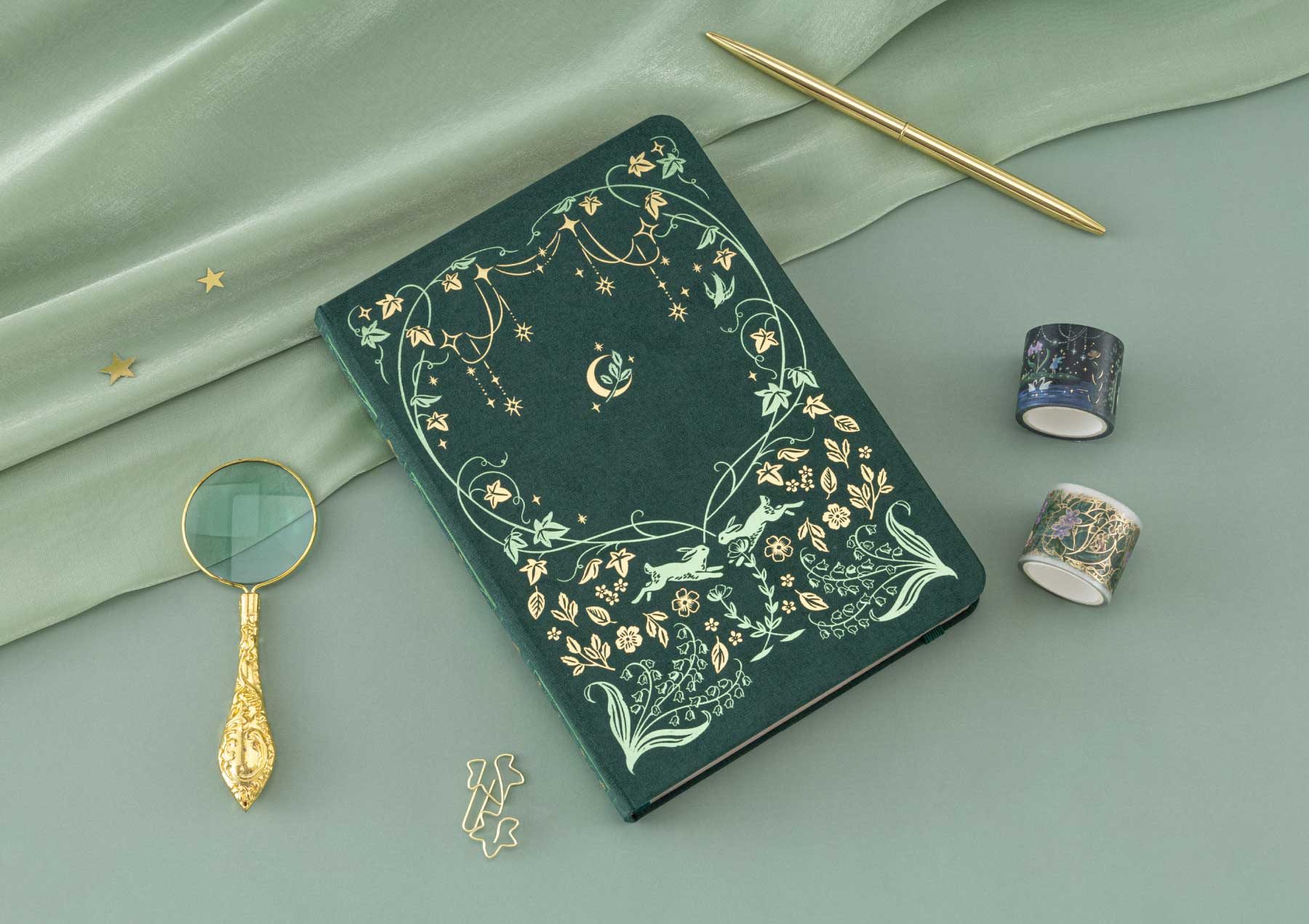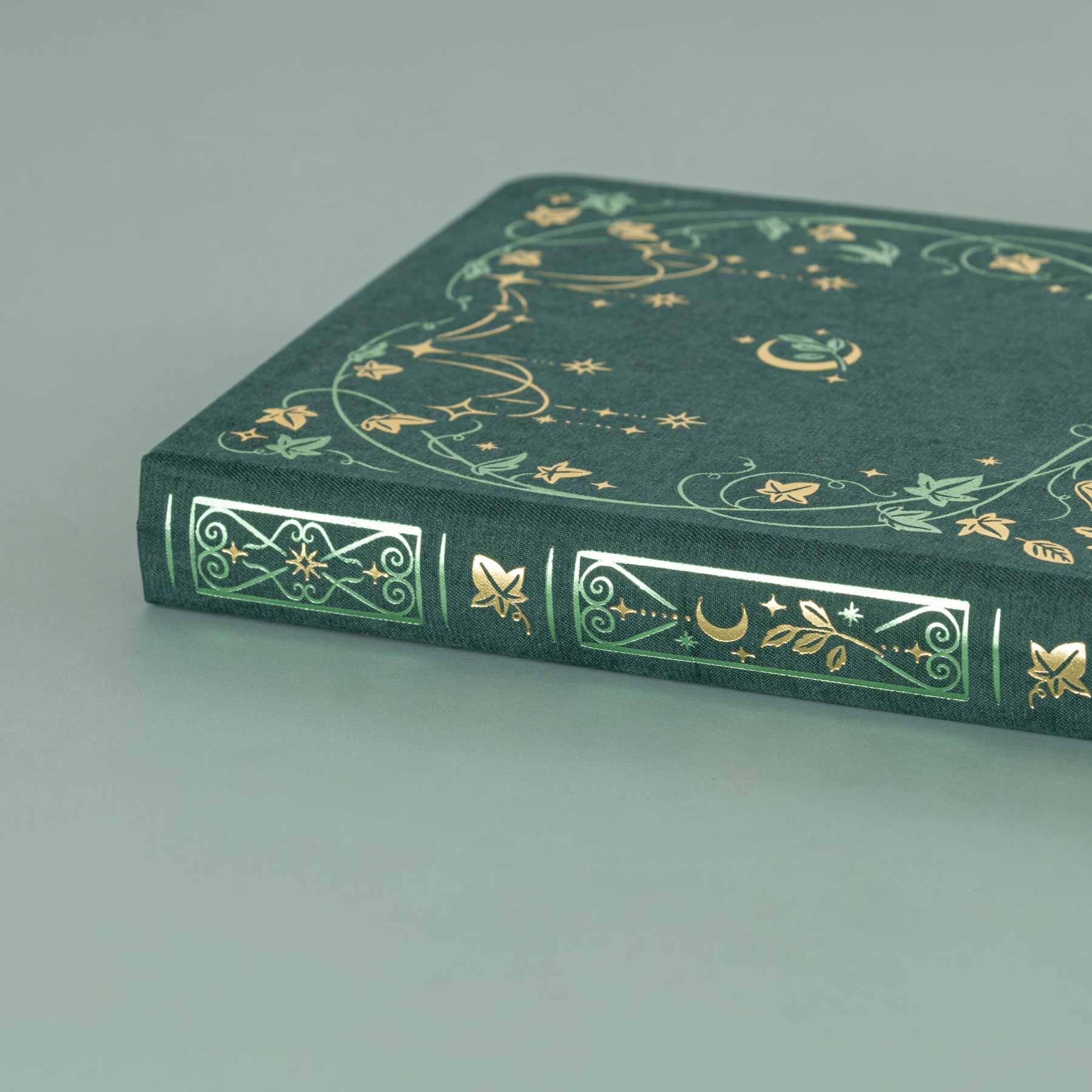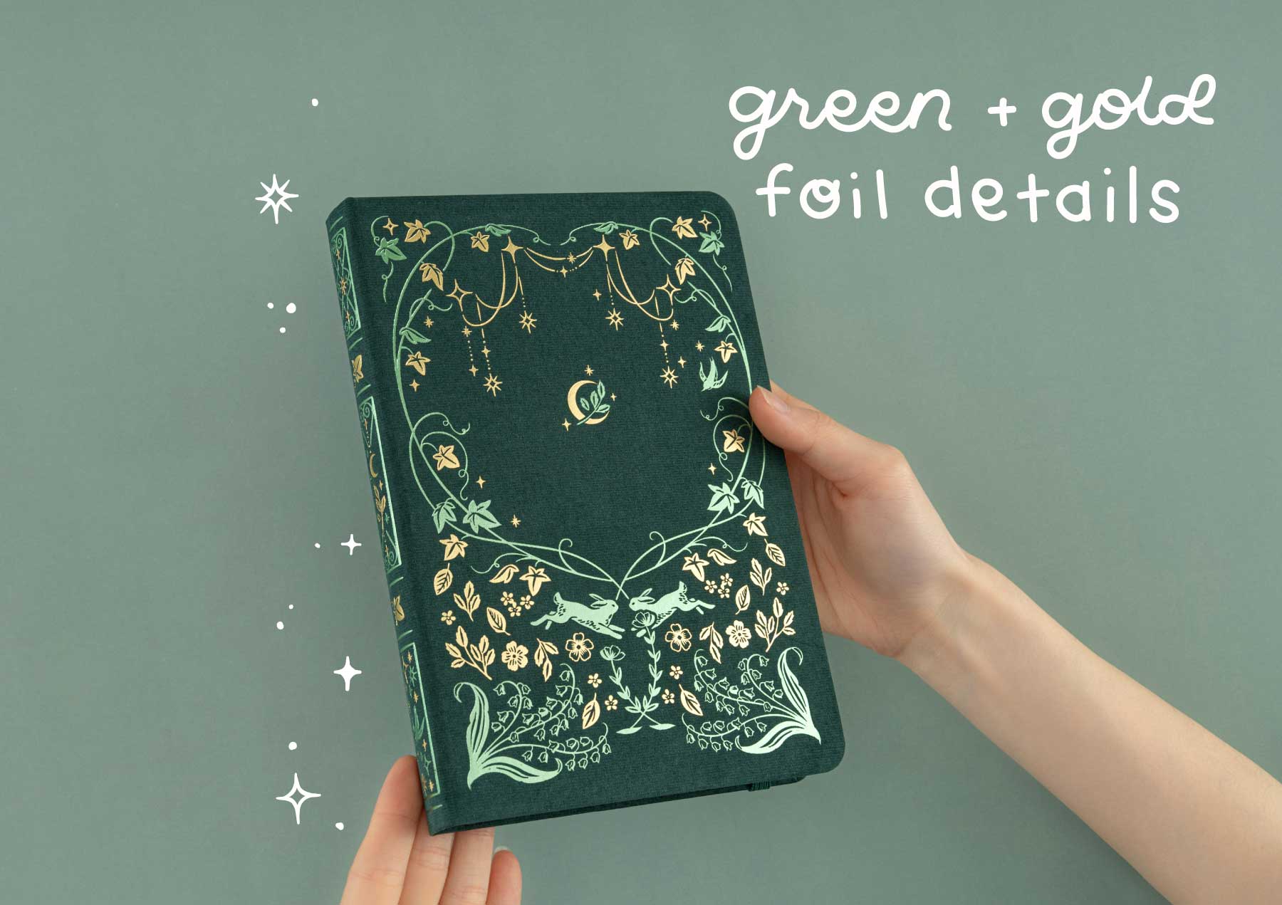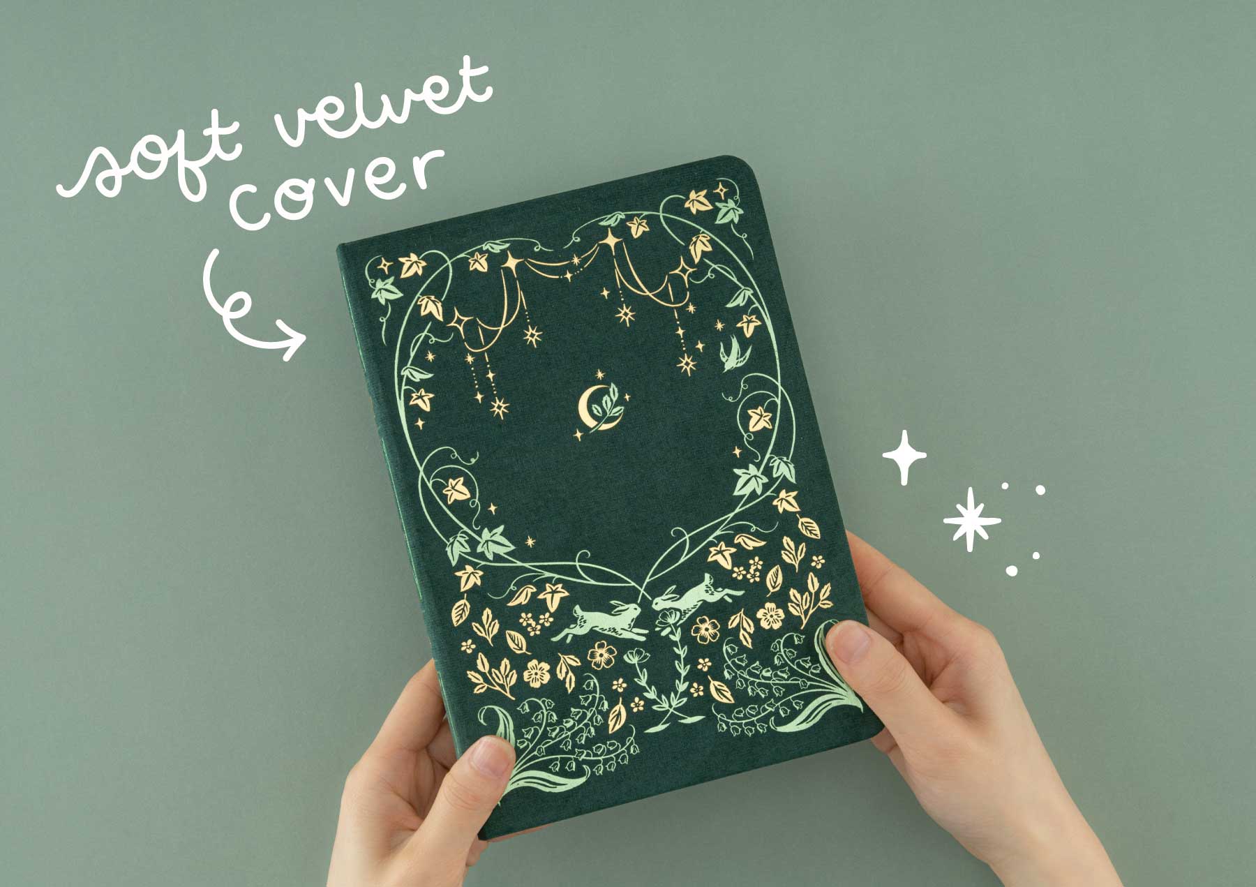 Inspired by the magical garden that comes alive at night, this bullet journal features our signature bright white dot grid pages wrapped in a soft leaf green velvet cover. Adorned with a stunning two-toned botanical foil design in matte gold and green gold, it’s the perfect place for your most enchanting bullet journal spreads. Complete with a beautiful free gift and vintage aesthetic page edges for a touch of magic.