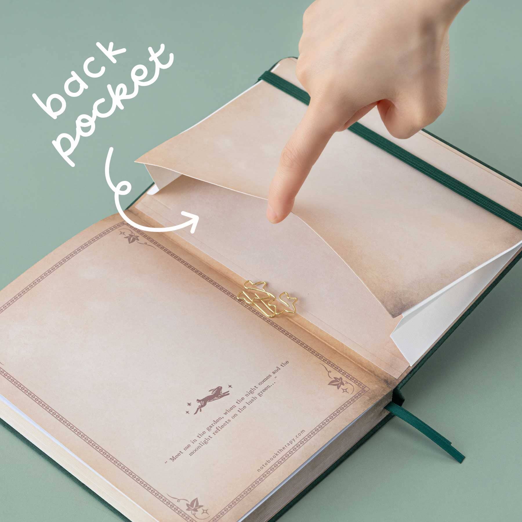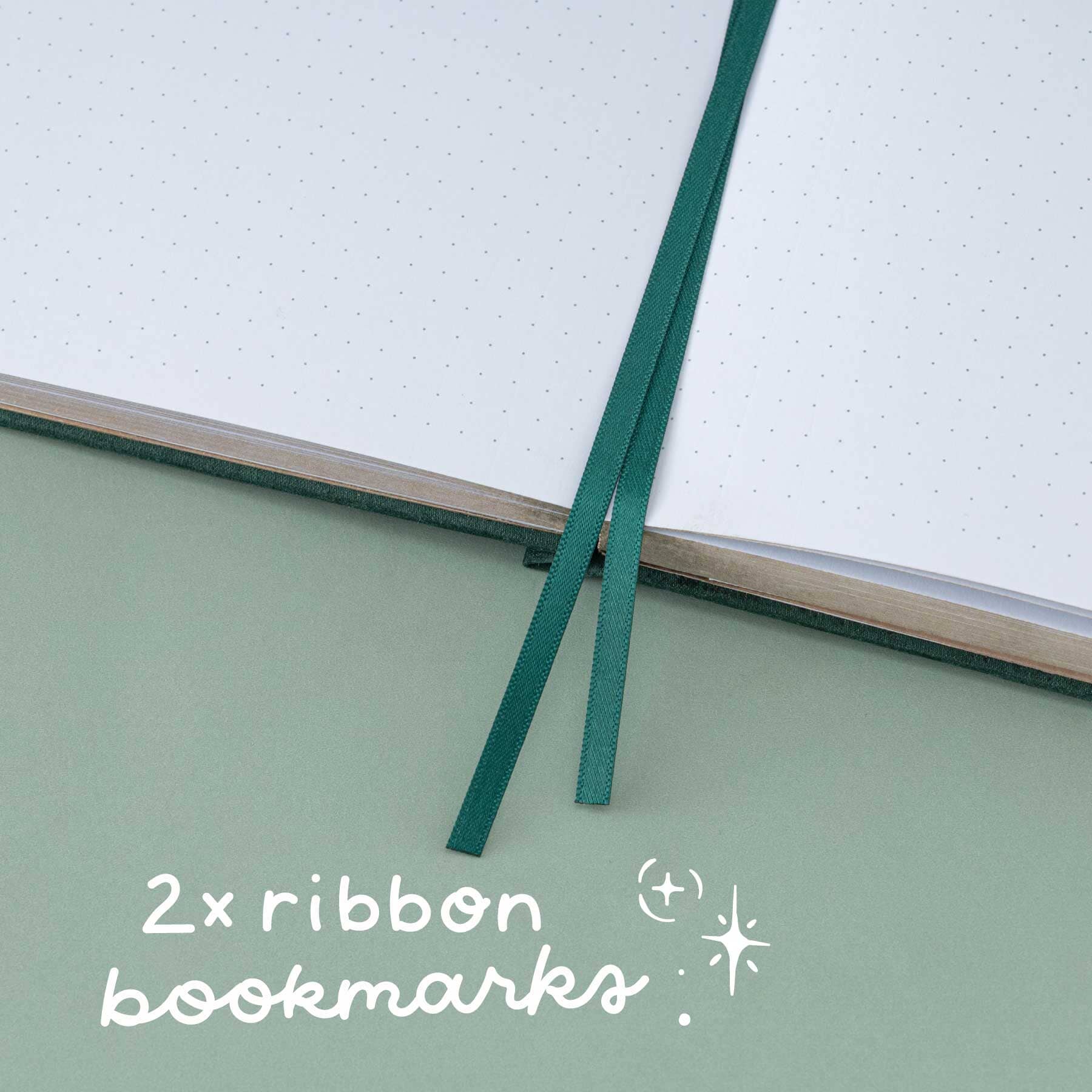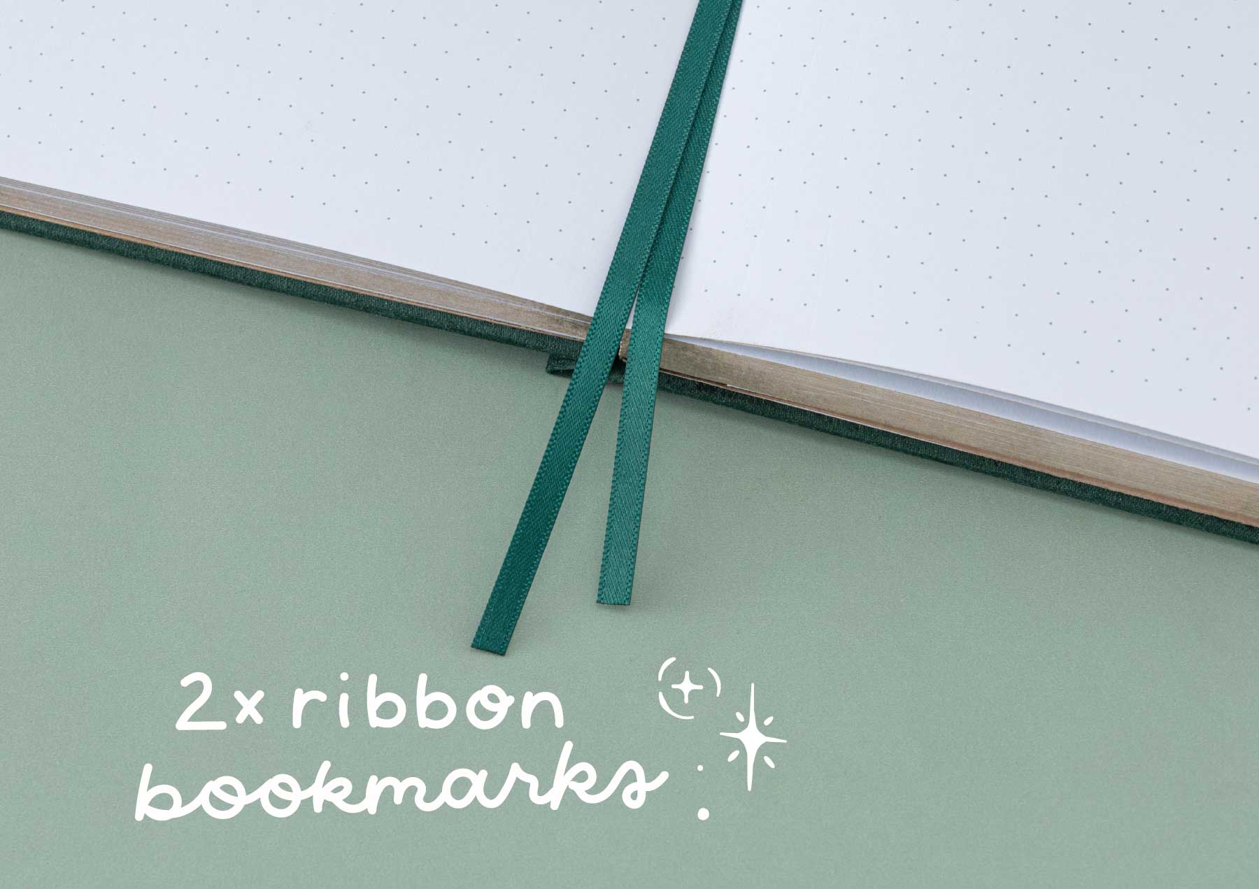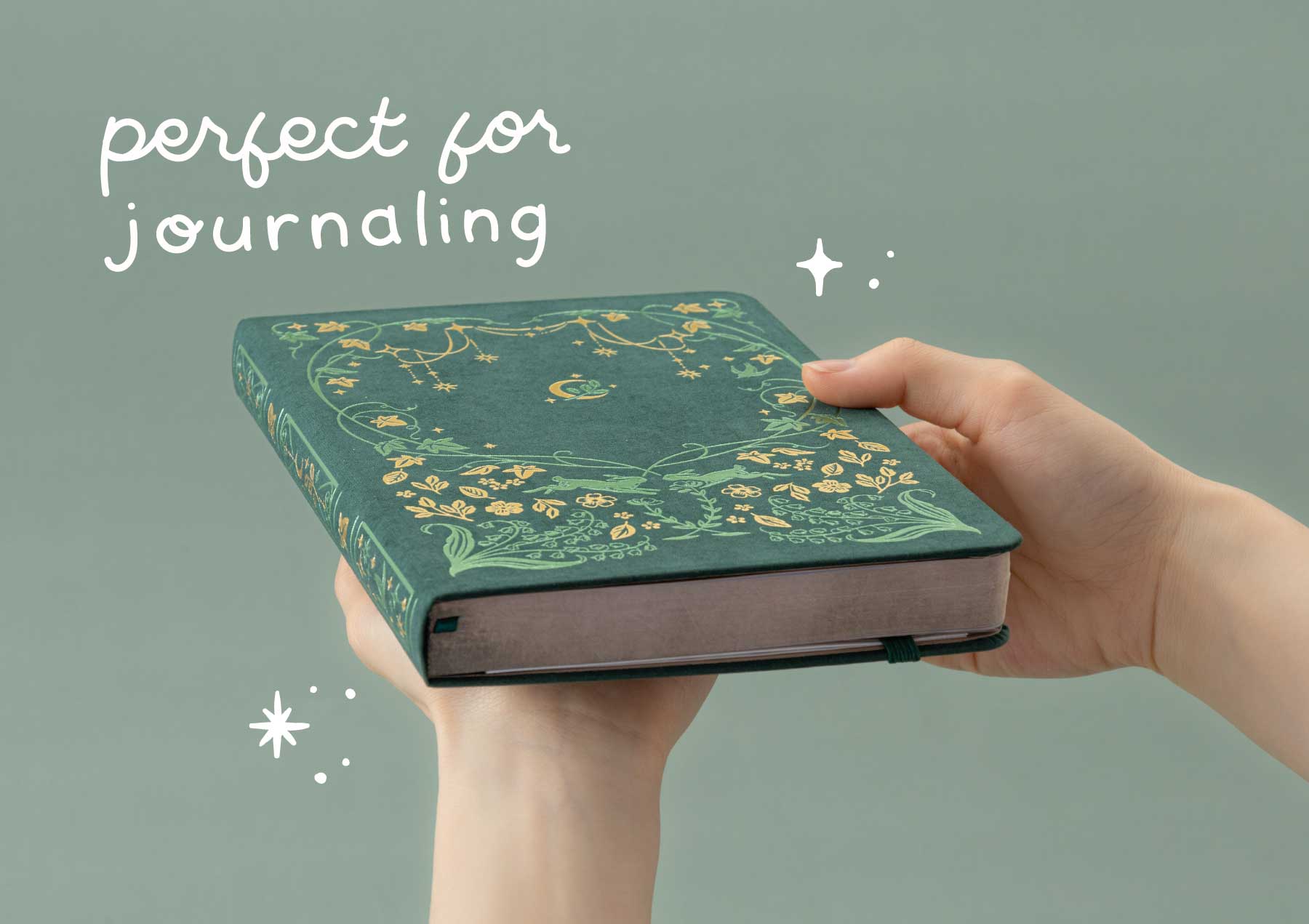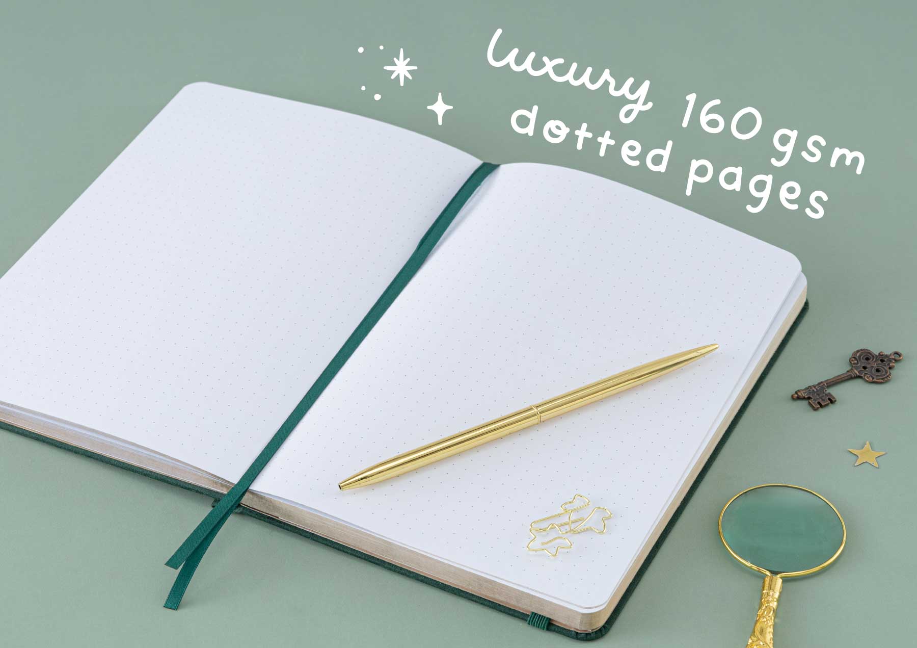 Inspired by the magical garden that comes alive at night, this bullet journal features our signature bright white dot grid pages wrapped in a soft leaf green velvet cover. Adorned with a stunning two-toned botanical foil design in matte gold and green gold, it’s the perfect place for your most enchanting bullet journal spreads. Complete with a beautiful free gift and vintage aesthetic page edges for a touch of magic.