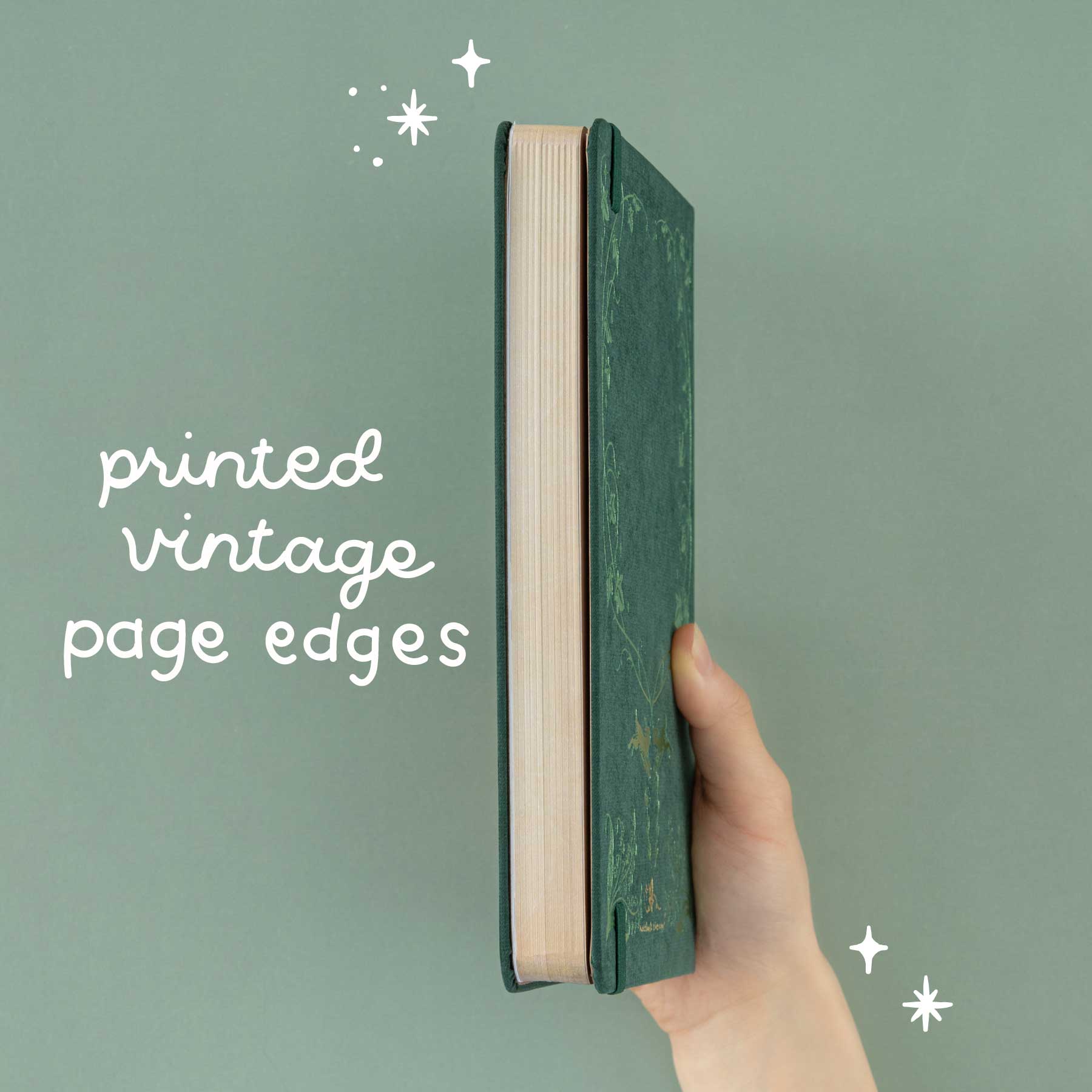- Beautiful matte gold + green foil details + printed vintage page edges