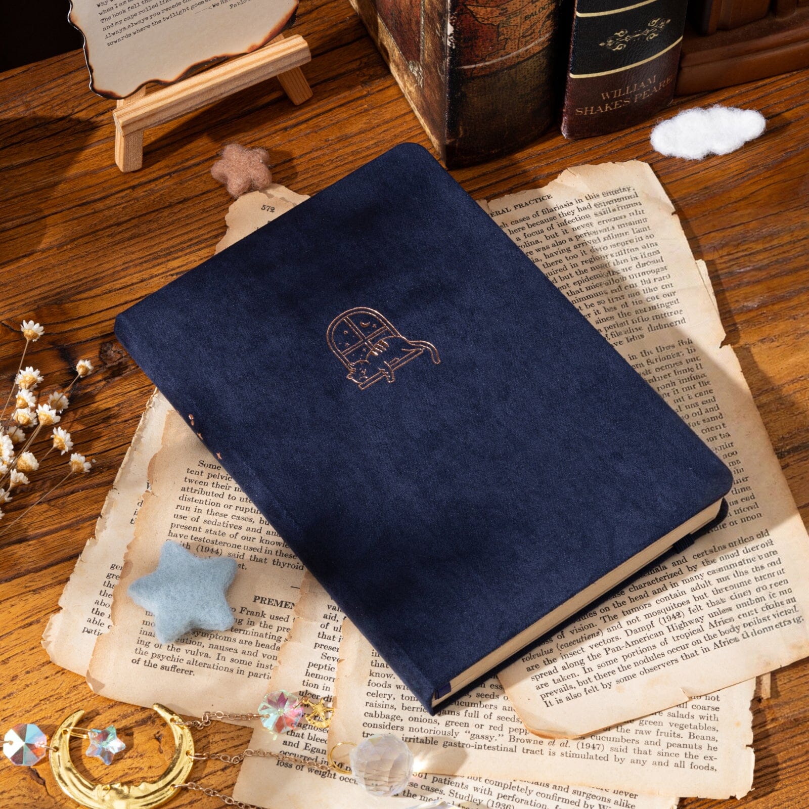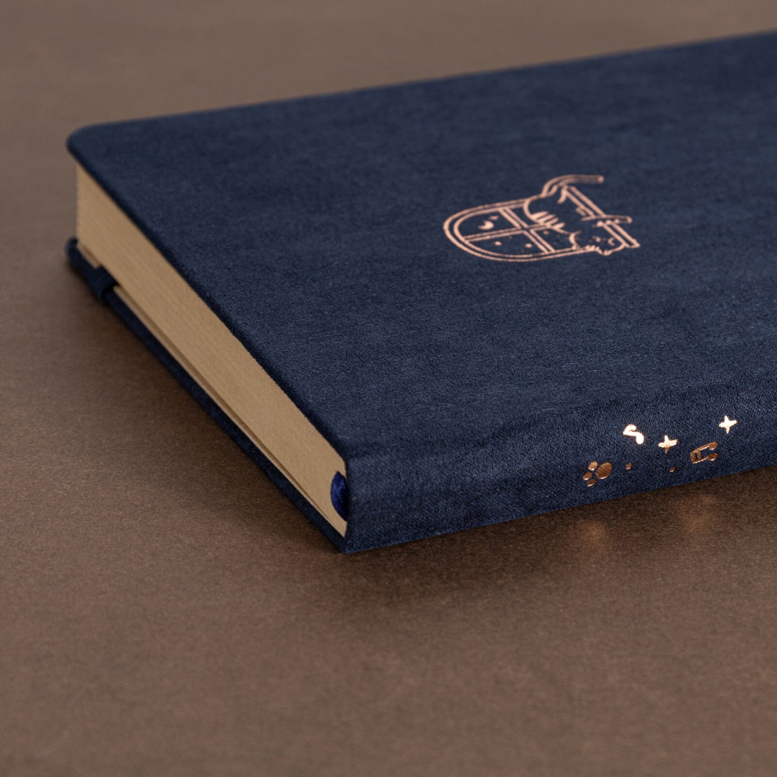 Inspired by adorable cats and extreme cosiness, our Tsuki ‘Midnight Neko Dreams’ Bullet Journal is wrapped in a deep navy blue velvet cover with intricate rose gold foil detail. This charming addition to our beloved Tsuki 150gsm kraft paper dot grid notebooks features a cat on the window sill, watching the world fade into night - the ultimate cosy journaling companion!