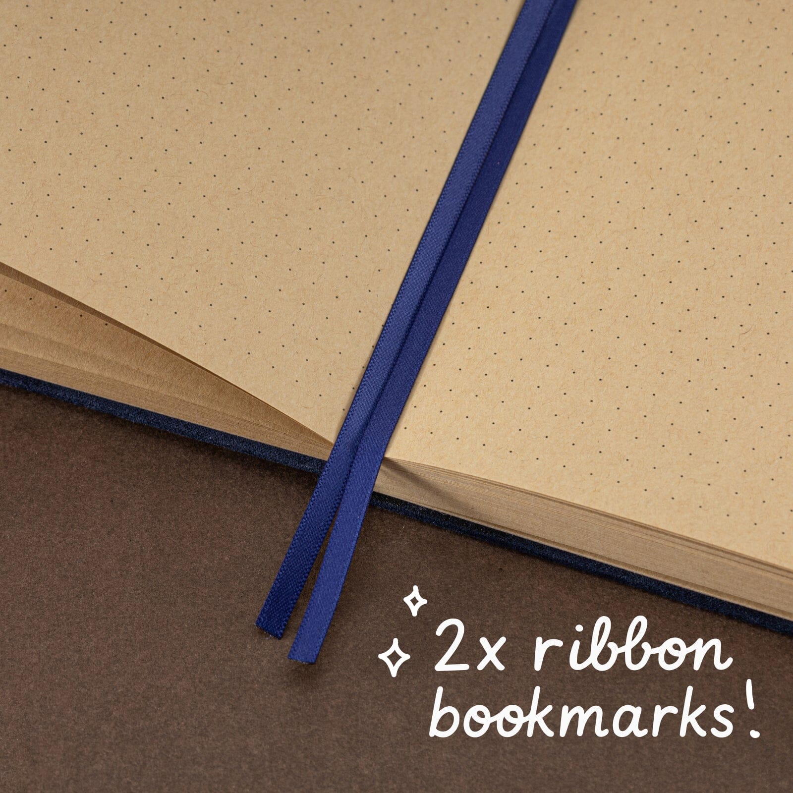 Two navy ribbon bookmarks inside Tsuki Midnight Neko Dreams kraft notebook.