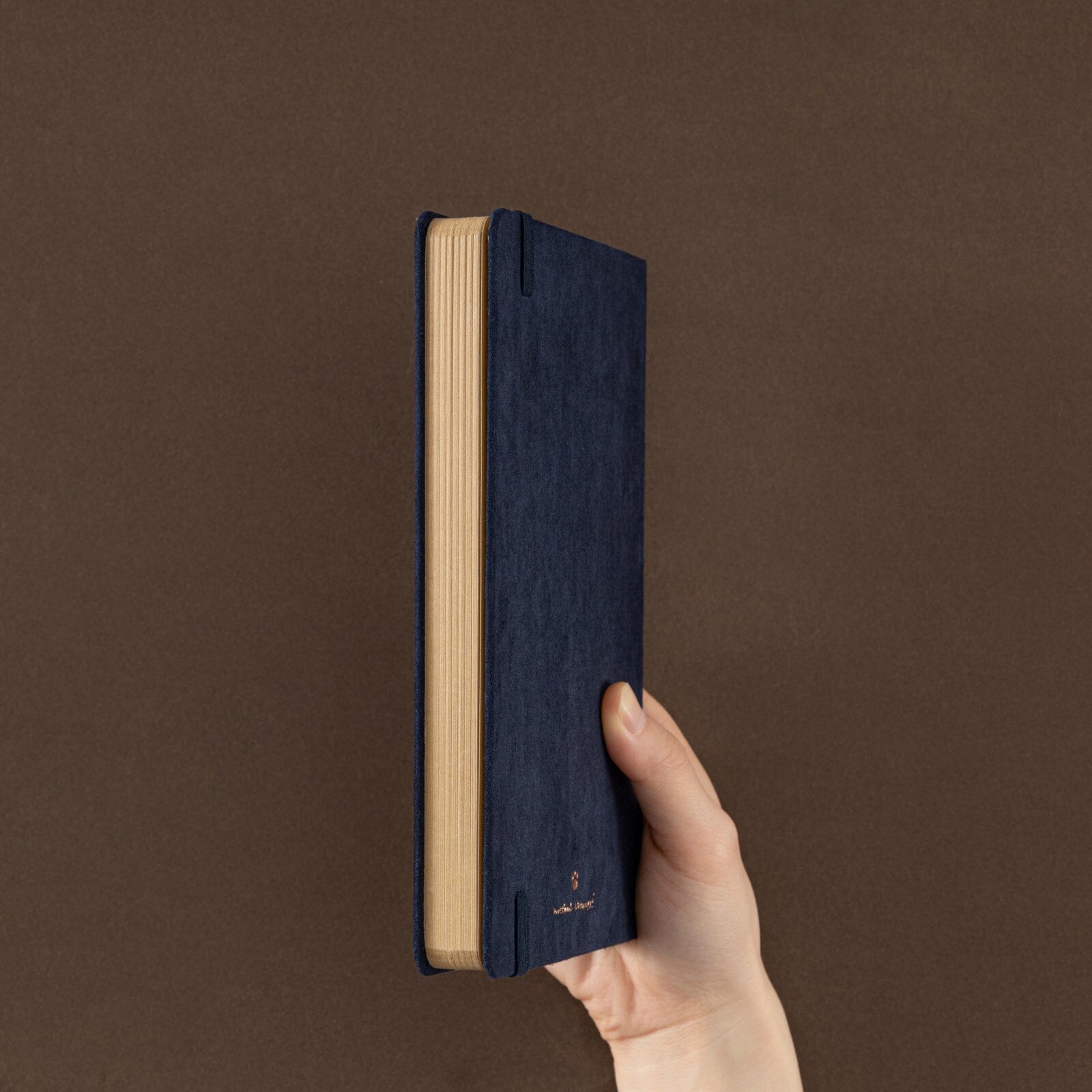 Tsuki Midnight Neko Dreams notebook held in hands, showing compact size perfect for journaling.