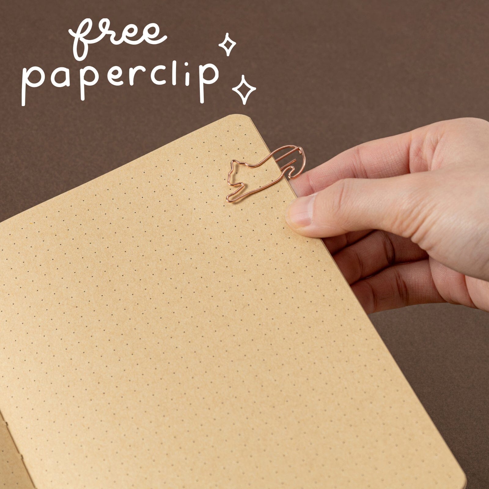 Free copper cat-shaped paperclip inside Tsuki Midnight Neko Dreams kraft notebook.