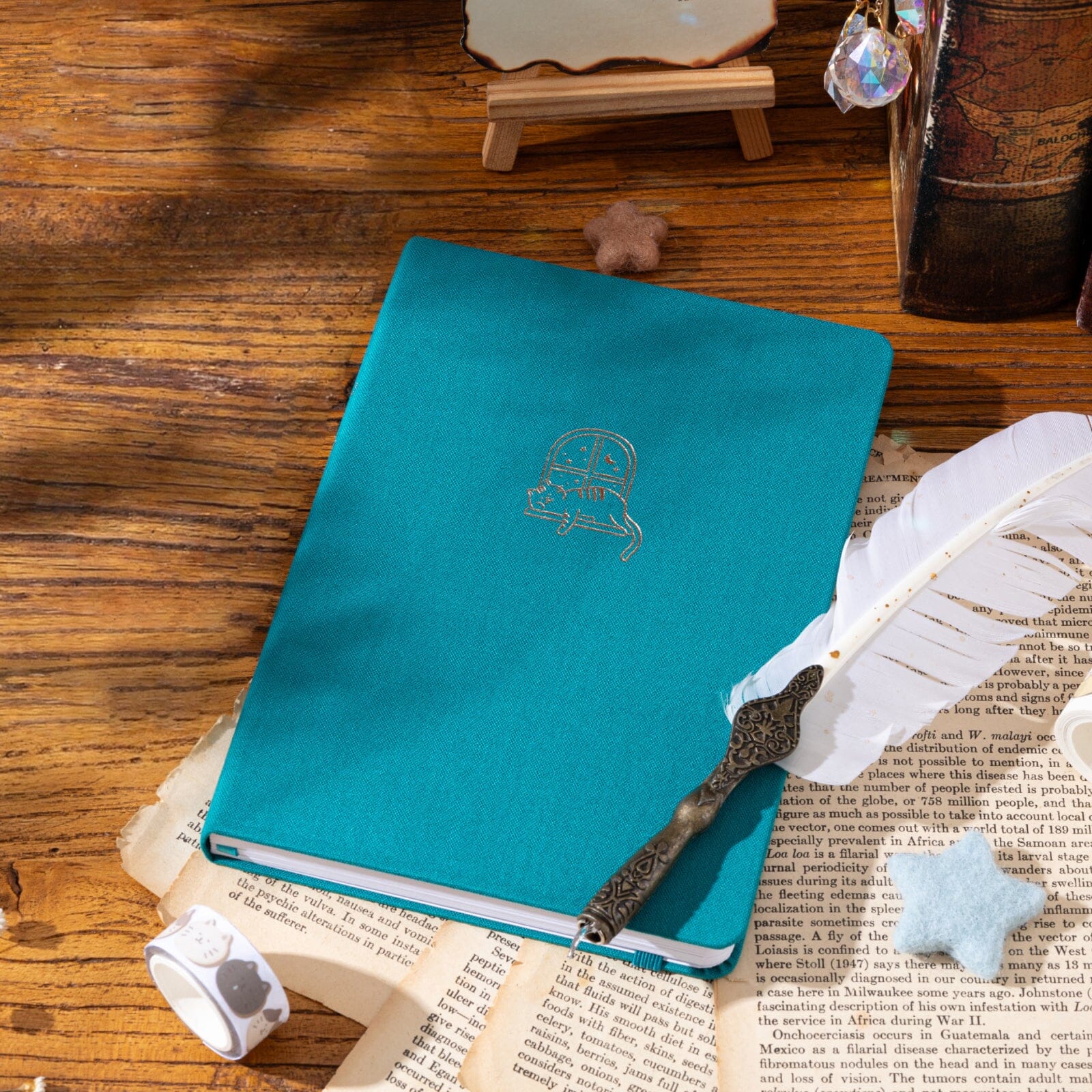 Tsuki Neko Dreams Sleepy Neko Notebook styled with gold pen, dried flowers, and cozy star and cloud props.