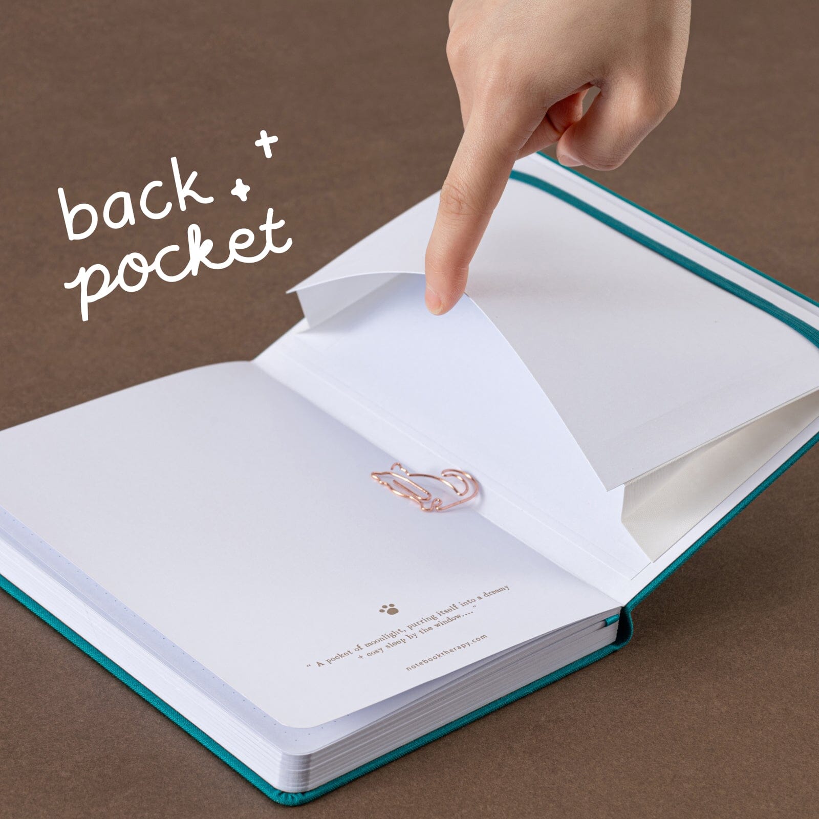 • Back storage pocket, with free cat paperclip gift + elastic band closure