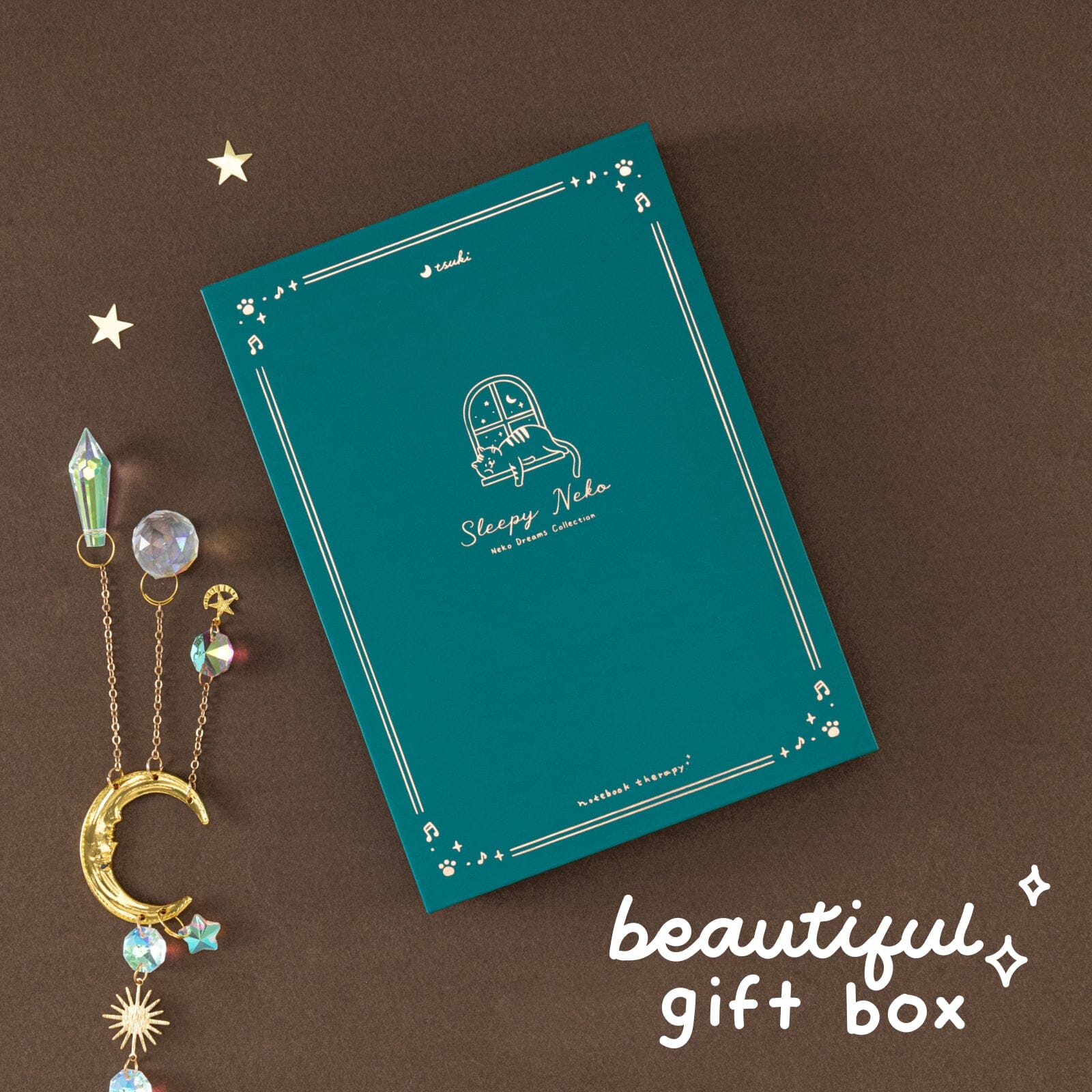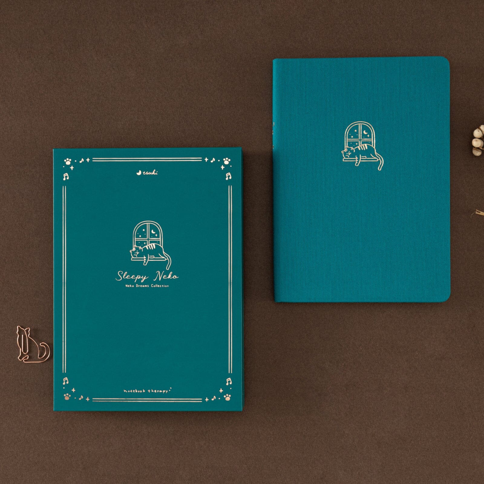 Tsuki Neko Dreams Sleepy Neko Notebook with matching gift box, featuring gold-foiled cat sleeping by the window design.