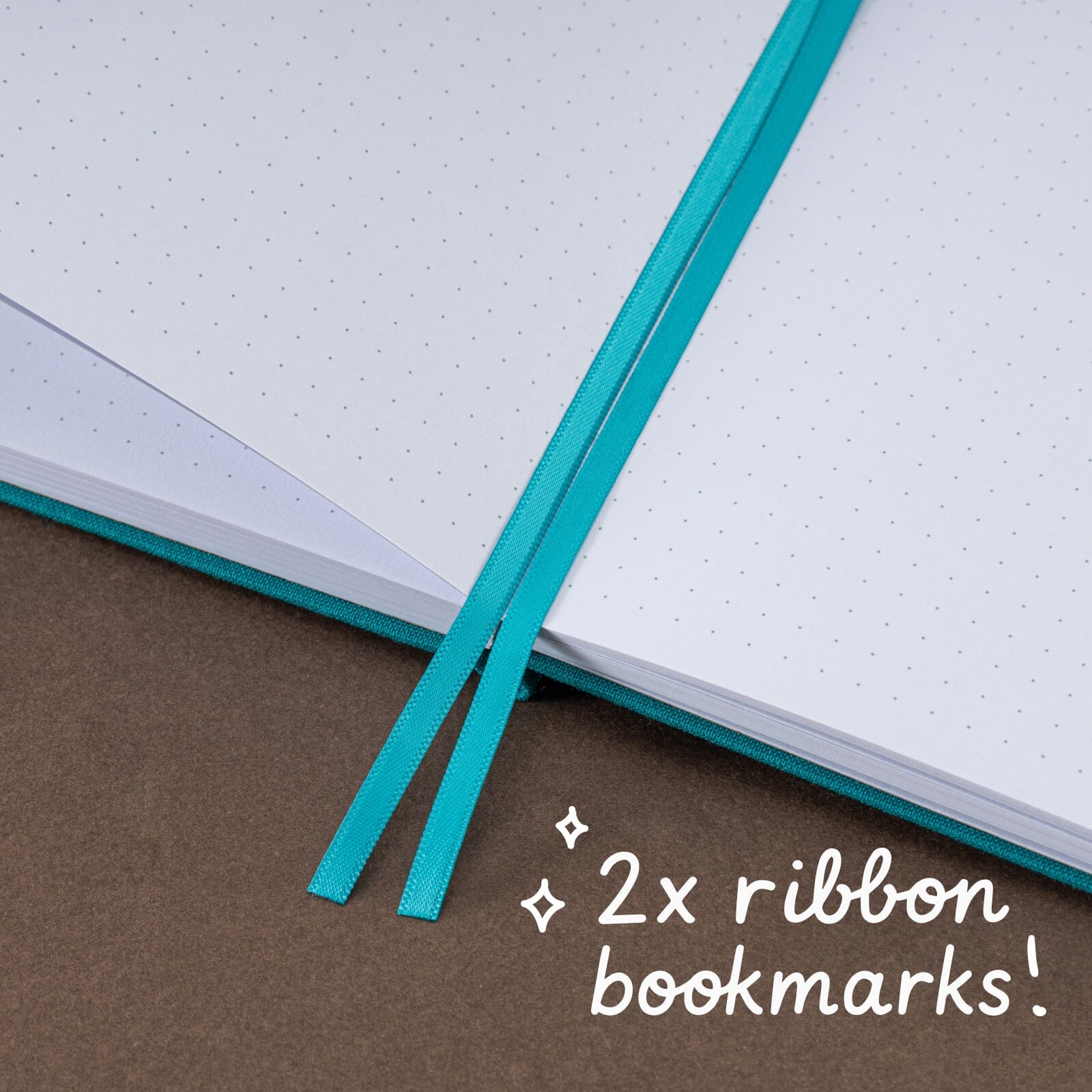 Tsuki Neko Dreams Sleepy Neko Notebook open to dotted pages with dual turquoise ribbon bookmarks.