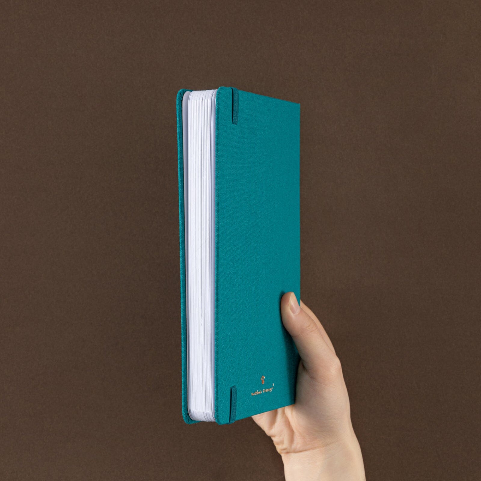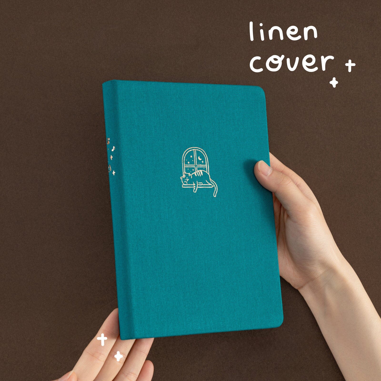 Hands holding Tsuki Neko Dreams Sleepy Neko Notebook showing teal linen cover with sleeping cat gold foil design.