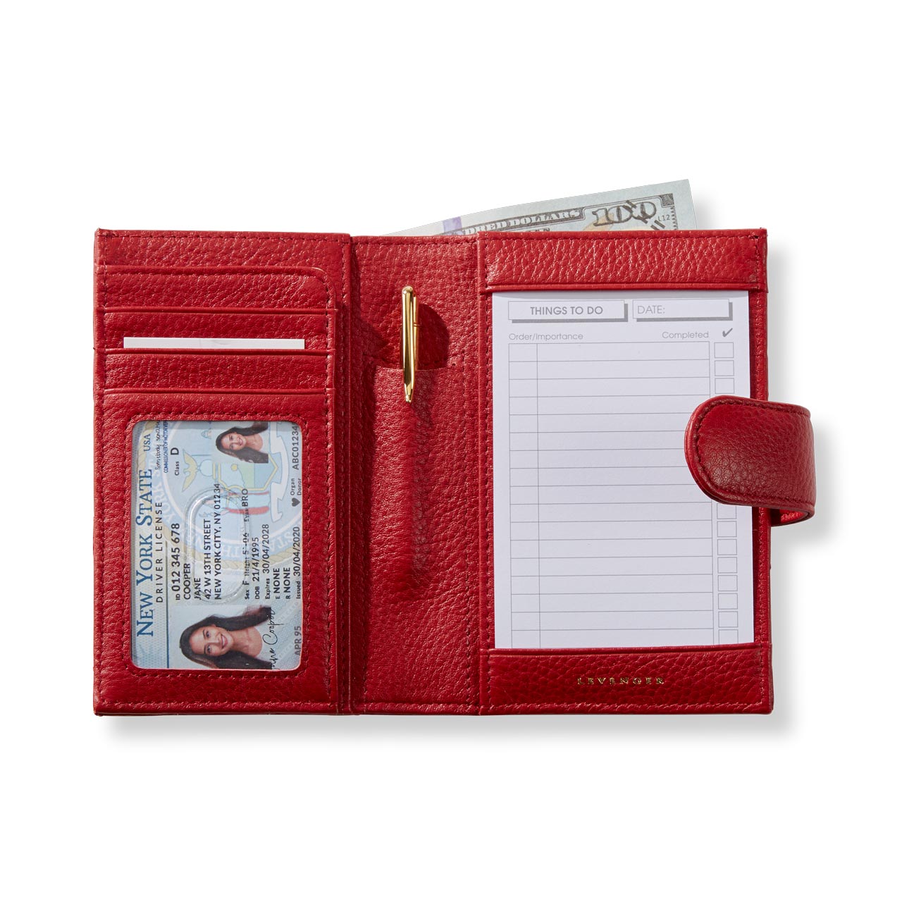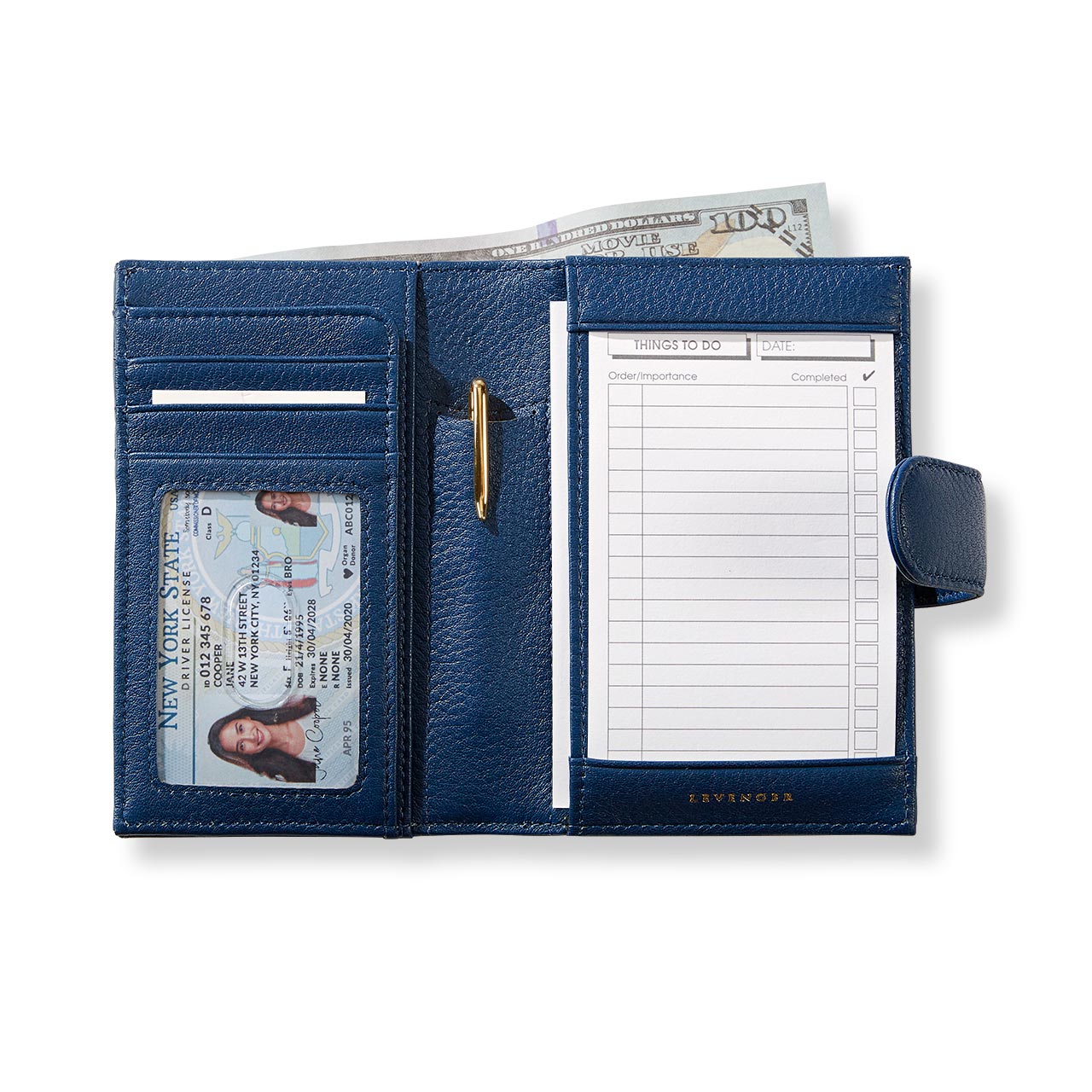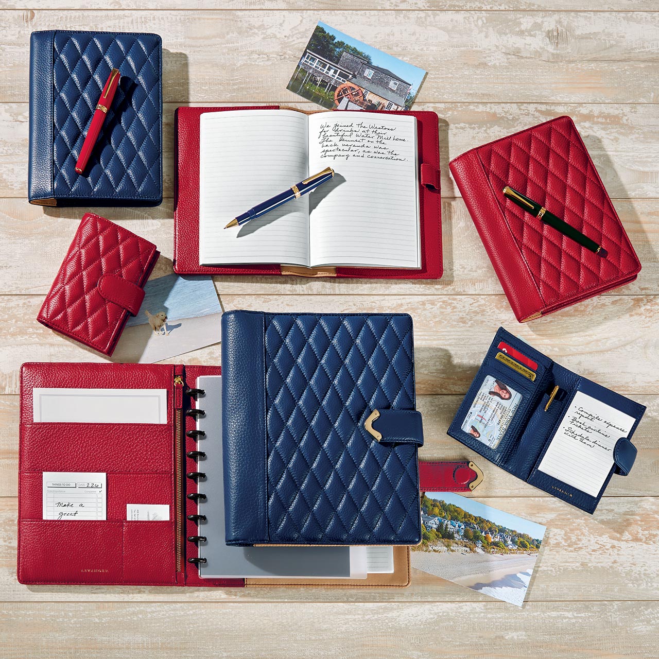Add a little luxury to on-the-go note-taking with the Hamptons International Pocket Briefcase, elegantly crafted in quilted full-grain leather. This pocket-size folding leather notepad has a writing platform for 3 x 5 cards, dispenses fresh cards and keeps completed ones separate. It has stash pockets for business cards, ID, a passport and a pen—our gold Walletini ballpoint is included.