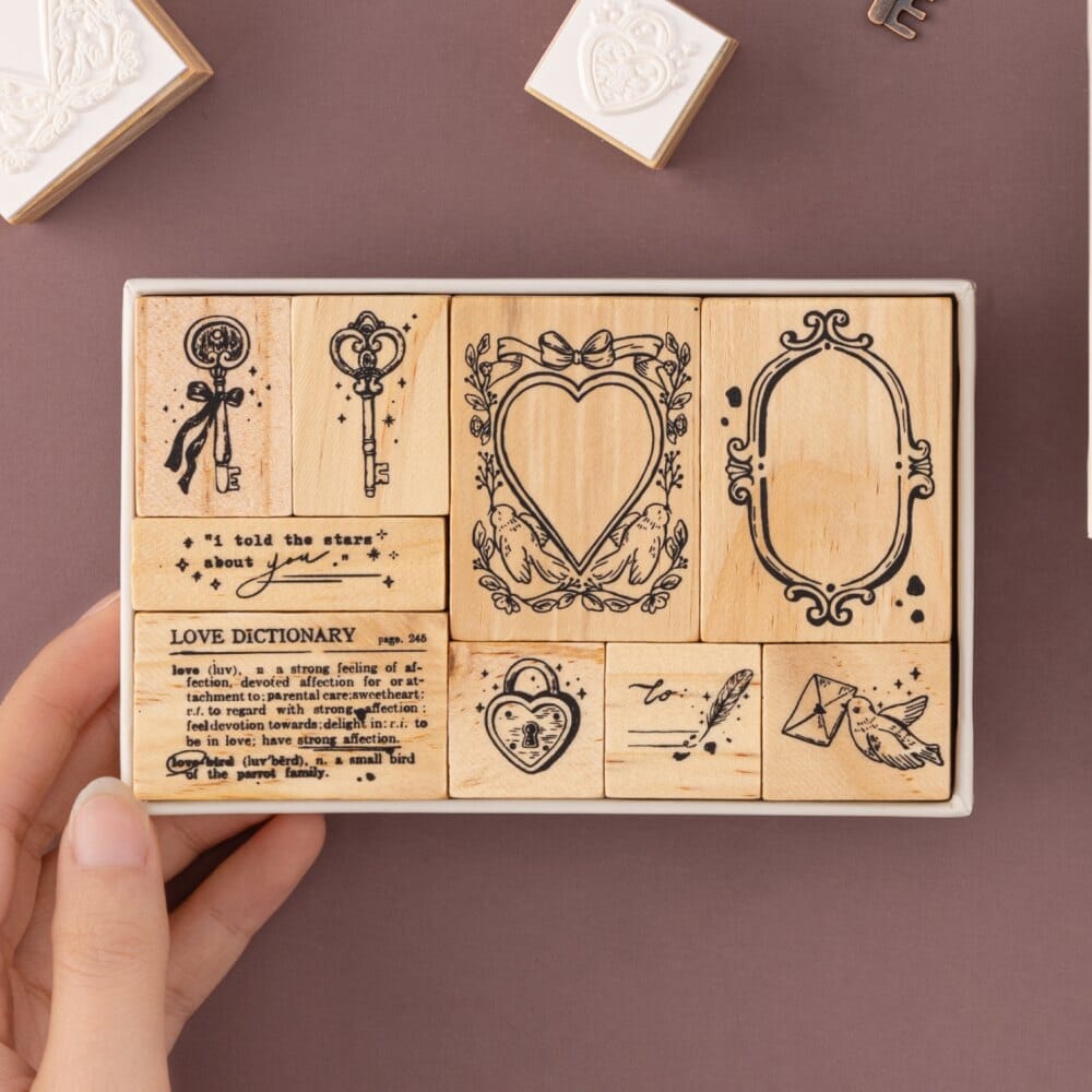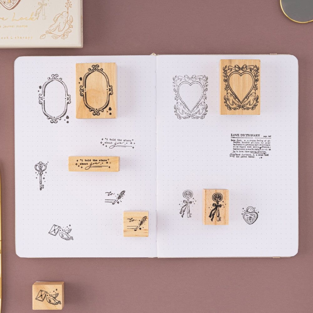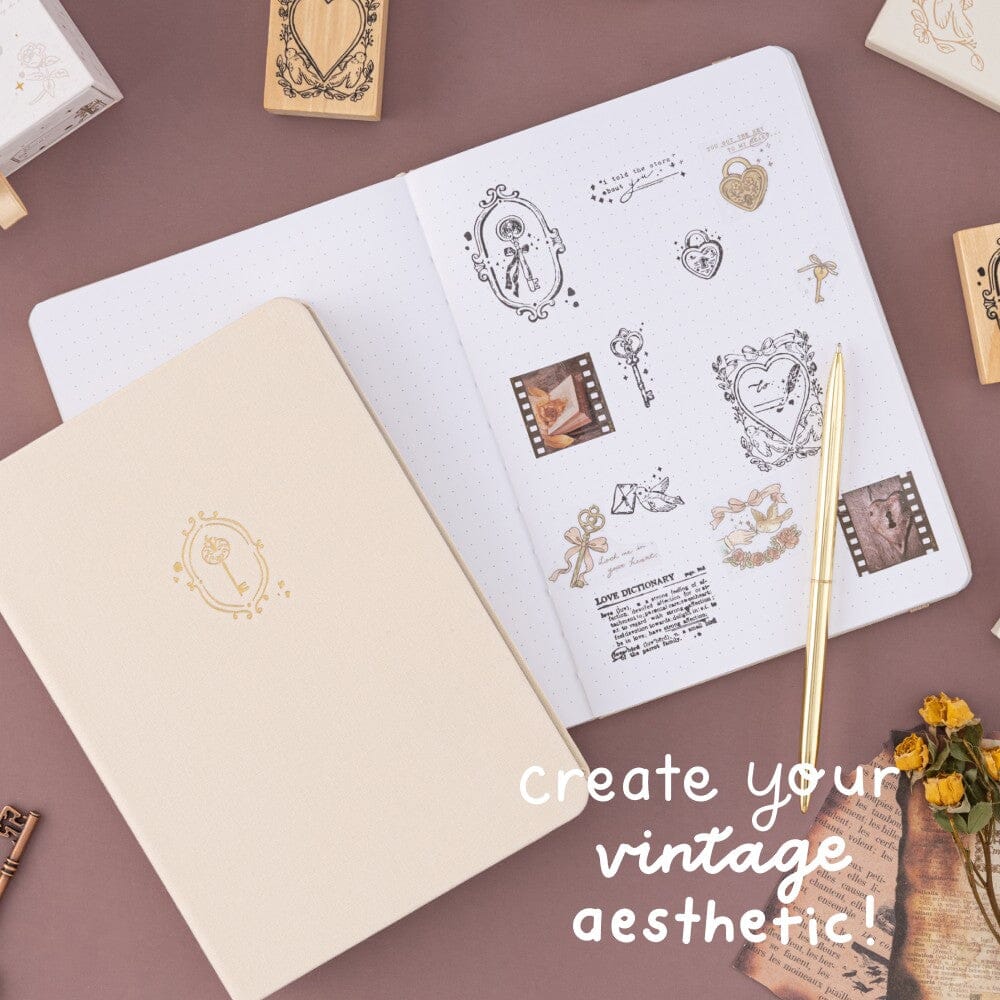 Perfect for bullet journaling, pen pal letters, scrapbooking, and more - this vintage-style stamp set is part of our new ! Find everything from elegant key stamps to functional frames and border stamps in this beautifully romantic set, created to help you capture a vintage aesthetic with ease. Pair with our Love Lock bullet journal to make a special gift to yourself or fellow stationery addicts!