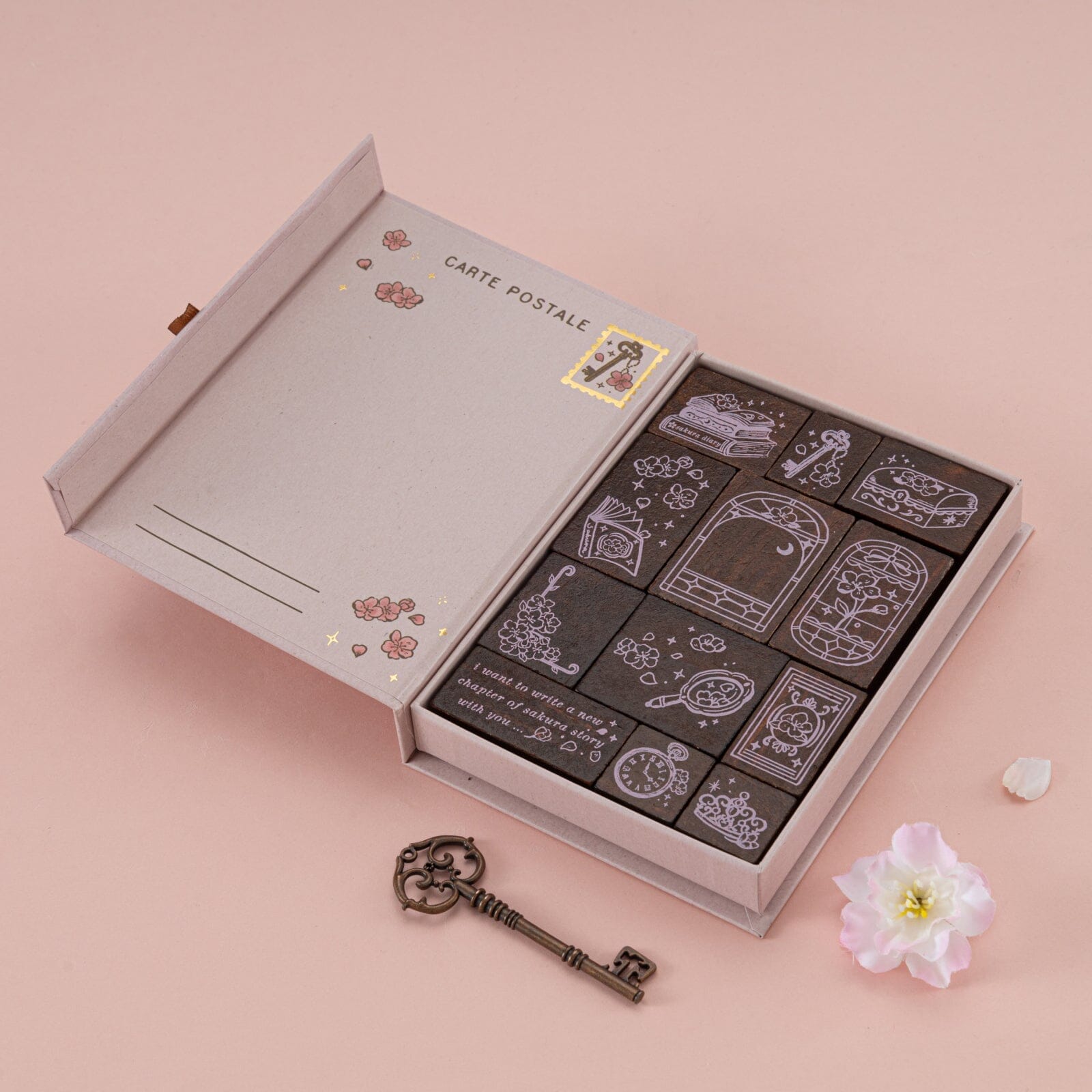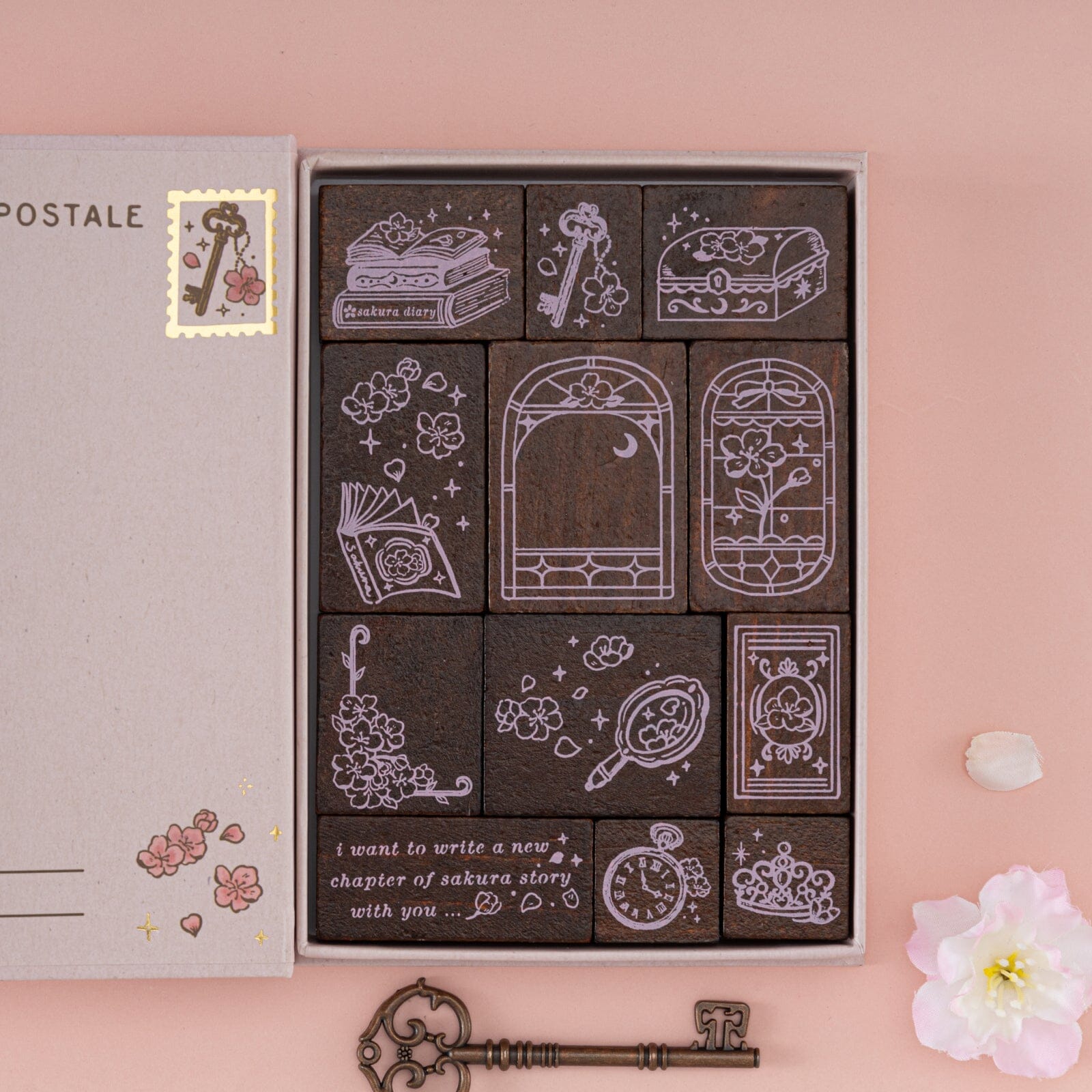 Crafted from natural wood, this unique stamp set of 12x vintage-inspired stamps brings a refined elegance to your bullet journal spreads. Open up the magnetic gift box that opens up like a book to reveal all the stamp featuring delicate sakura details + timeless vintage icons that unfold like a story across the page, each design adds intention to your daily journaling. For a complete sakura aesthetic, match with any items from our .
