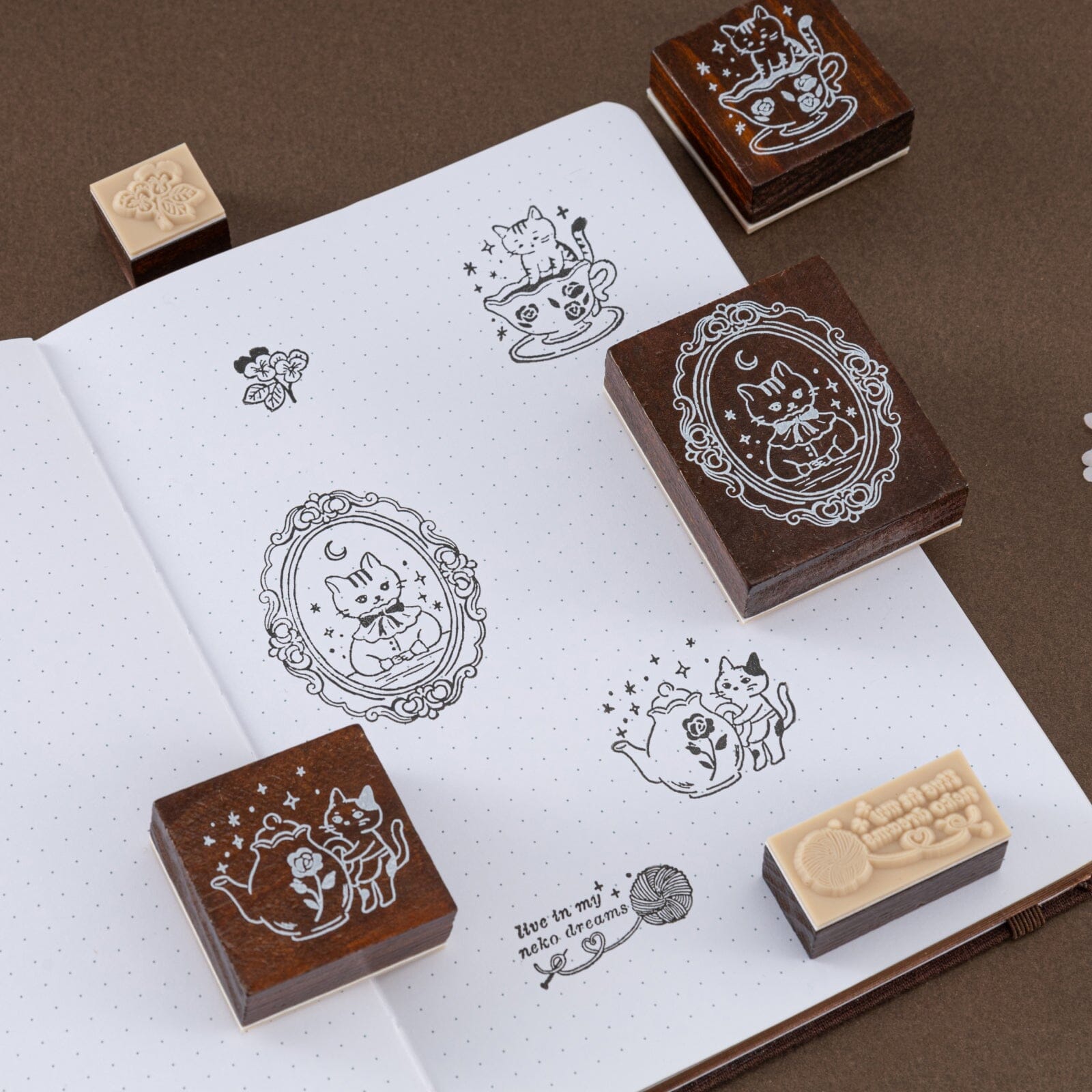 A close-up shot of a hand pressing a wooden cat stamp onto a dotted journal page, surrounded by other stamp impressions and the open product box.