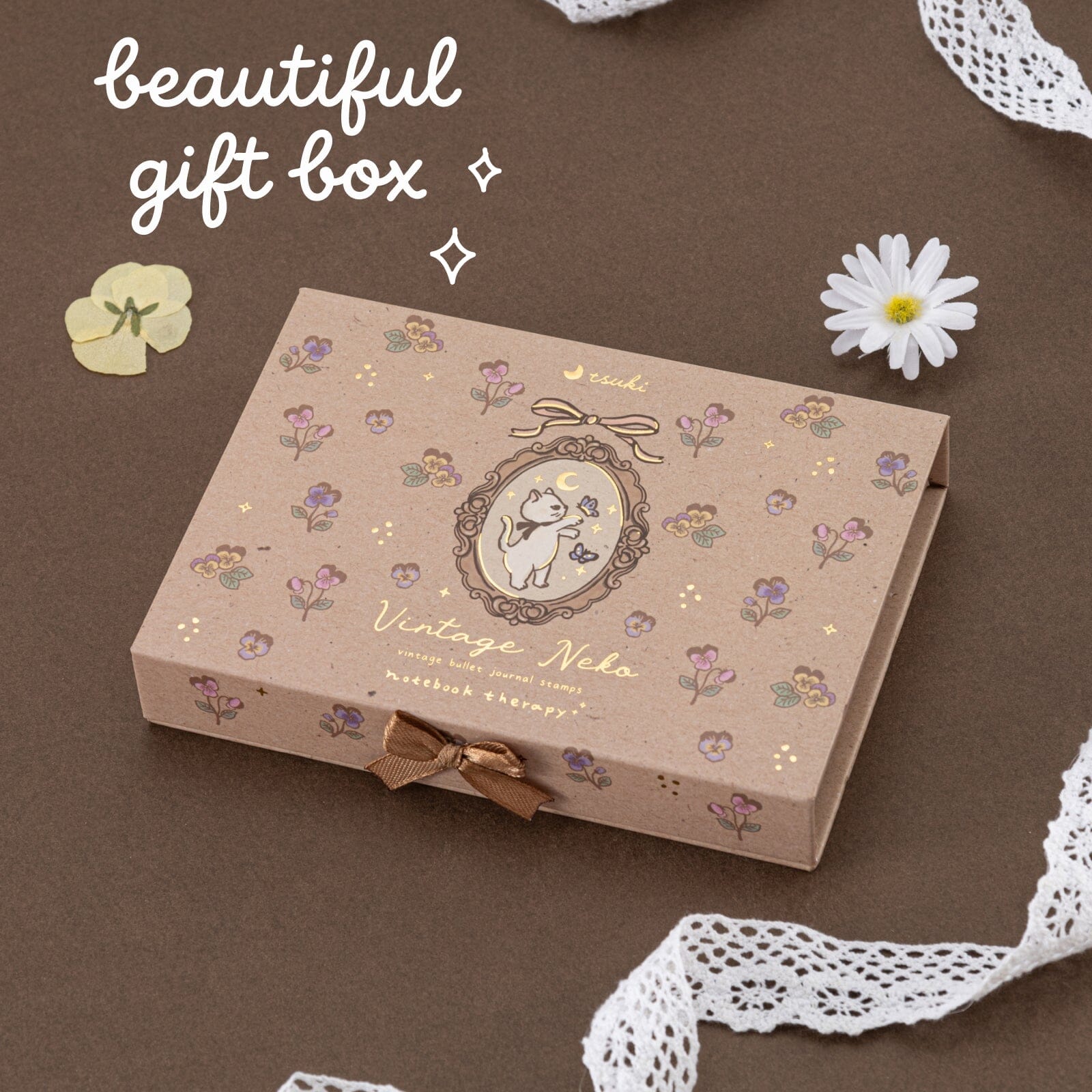 This unique wooden stamp set features 9x vintage-style charming cat designs, perfect for adding an elegant touch to your bullet journal spreads featuring cats reading + making tea, lovely florals, and vintage elements. For a complete aesthetic, pair it with any items from our Tsuki Collection.